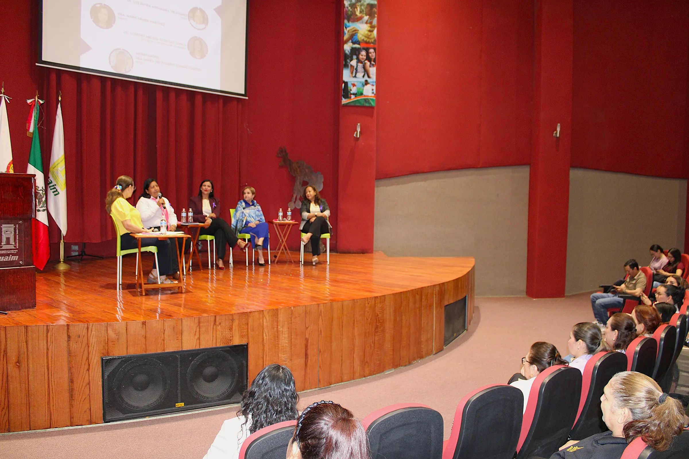 El panel estuvo conformado por mujeres con una sólida trayectoria profesional y social: la Lic. Lourdes Melisa Estavillo Zavala, titular de la Secretaría de las Mujeres del municipio de Ahome; la Lic. Luz Elvira Anguamea Velázquez, representante de la cultura yoreme y egresada de la primera generación de la Licenciatura en Trabajo Social con especialidad en Educación en la Universidad Autónoma de Sinaloa; la Dra. María del Carmen Martínez Valenzuela, profesora investigadora de la Universidad Autónoma de Occidente; y la Mtra. Yolanda Félix Salgueiro, especialista en Psicología Educativa y Desarrollo Humano. La moderación estuvo a cargo de la Dra. María del Rosario Romero Castro, quien guió el diálogo con preguntas que invitaron a la reflexión sobre los mitos, las políticas públicas y las experiencias vitales que marcan la vida de las mujeres en su doble papel como ciudadanas y madres.